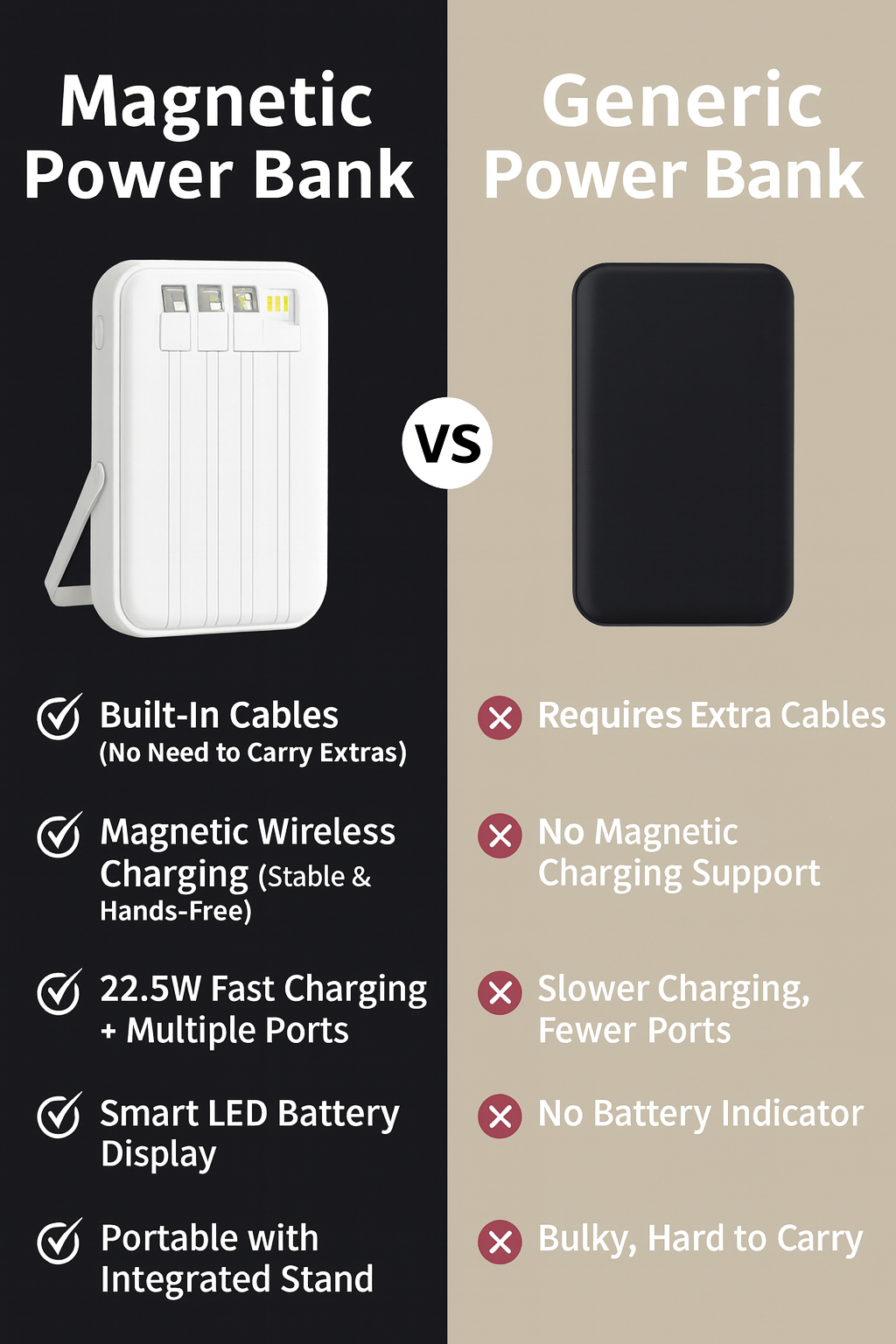 The power bank supports 22.5W fast charging with cables and 15W wireless fast charging, giving your devices a quick boost when you need it most.